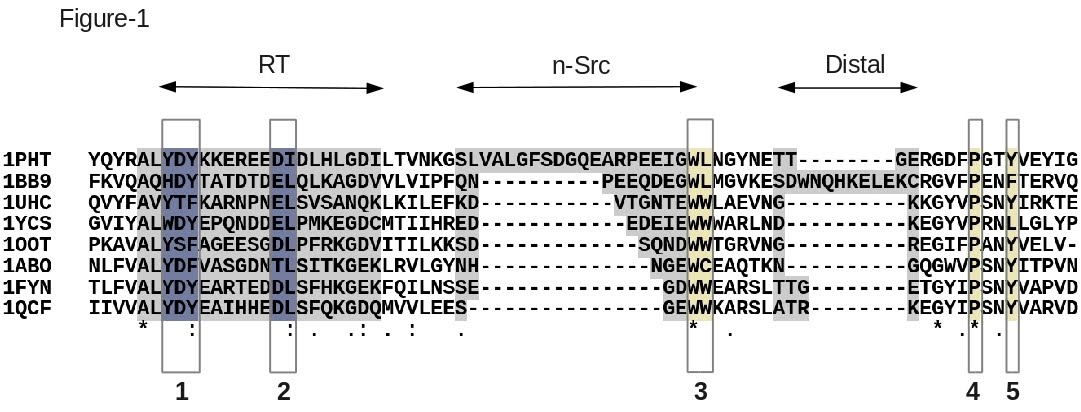 T-Coffee provides four different modes for protein alignments: T-Coffee (tcoffee default mode), Fast M-Coffee (fmcoffee), PSI-Coffee (psicoffee) and Expresso/3D-Coffee (expresso). Each of these modes uses different type of information: comparisons of sequences, pairwise sequence alignments, sequence profiles and protein structures. There is no 'ideal' mode and they all involve some trade-off between computational cost and alignment accuracy. The choice will therefore depend on the dataset size (Fast M-Coffee, T-Coffee), on the availability of structural information (Expresso, 3D-Coffee) and on the required level of accuracy (PSI-Coffee). In the following section we will be using these four flavors of T-Coffee for the alignment of a set of eight SH3 domains with known 3D structures. A reference alignment of these sequences has been established by specialists [32] (Figure 1) and will be used to estimate the accuracy of the output alignments.